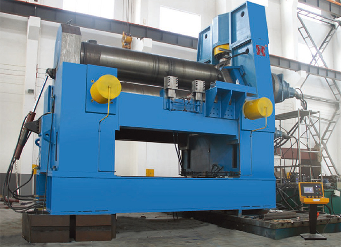 该机结构型式四辊式,上辊为主传动,通过减速机的输出齿轮与上辊齿轮啮合,为卷制板材提供扭矩;下辊作垂直升降运动,通过液压缸内的液压油作用于活塞而获得,以便夹紧板材,为液压传动;在下辊的两侧设有侧辊并沿着机架导轨作倾运动,通过丝杆丝母蜗轮蜗杆传动;该机优点是板材端部预弯及卷圆可以在同一台设备上进行。