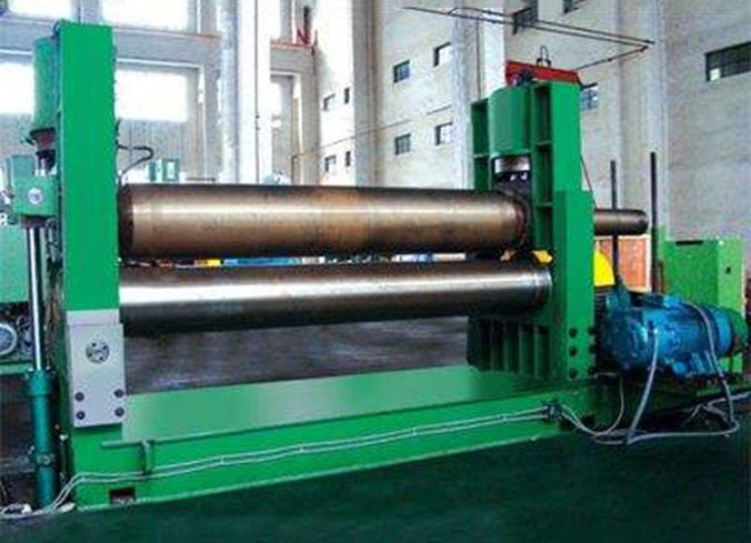 本机结构型式为三锟对称式,上辊在两下辊中央对称位置作垂直升降运动,通过液压缸内的液压油作用于活塞而获得,为液压传动;两下作旋转运动,通过减速机的输出齿轮与下辊齿轮啮合为卷制板材提供扭矩。本机床结构紧,操作维修方便。